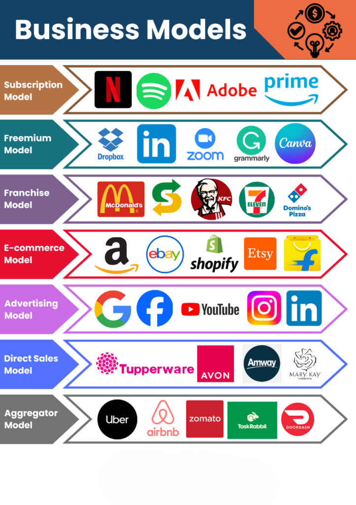 - Marketplace Model – Airbnb and Uber connect service providers with customers on a platform.